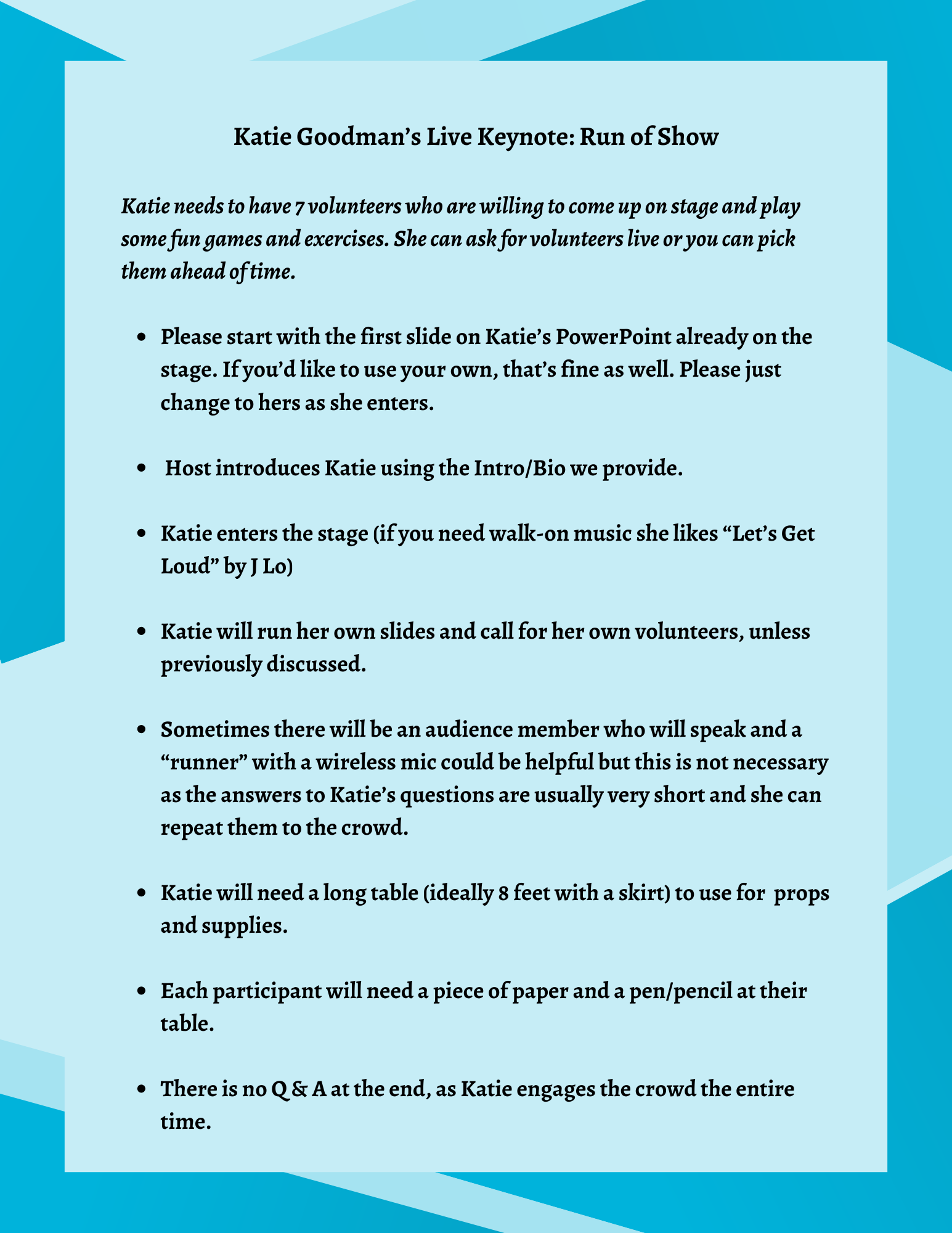 Tech Information (videos that explain Katie’s technical requirements and Katie’s run of show.
